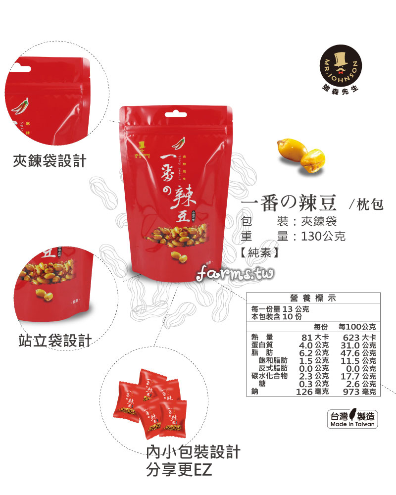 > 富強森-強森先生 > 長生果系列-麻辣花生.竹炭花生.芥末花生 > *[富強森-強森先生] 麻辣花生(枕包-分享包-素)130g*1包/~台灣在地花生,顆粒大花生味濃,獨特配方、麻勁十足、香辣爽口嗆辣滋味停不了