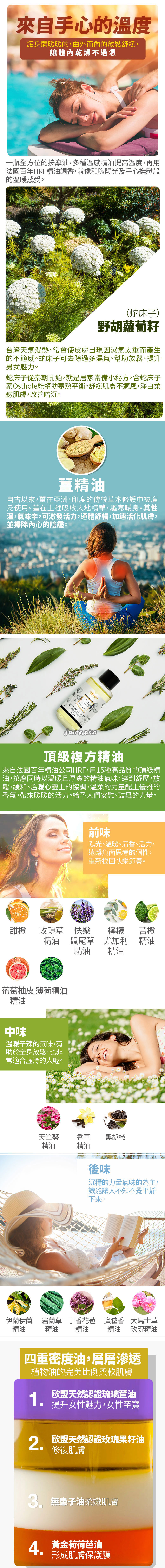 全成份:Coco caprylate/caprate椰子來源植物油、Simmondsia chinensis (jojoba) seed oil黃金荷荷芭油、Citrus aurantium dulcis peel oil expressed甜橙精油、Sapindus nut oil無患子油、Rosa rubiginosa seed oil玫瑰果籽油、Borago officinalis seed oil琉璃苣油、Pelargonium graveolens flower oil天竺葵精油、Piper nigrum fruit oil黑胡椒精油、Zingiber officinalis oil薑精油、Vanillyl butyl ether(發熱成分)、 Cananga odorata oil、Cymbopogon martini oil、Eugenia caryophyllus bud oil、Pogostemon cablin leaf oil、Salvia sclarea oil、Vetiveria zizanoides oil、Rosa damascena、Mentha piperita oil、Ethyl alcohol 、Pelargonium graveolens oil、Citrus grandis peel oil、Citrus aurantium amara oil、Eucalyptus citriodora oil、vanilla planifolia bean extract複方精油(伊蘭伊蘭精油、玫瑰草精油、丁香花苞精油、廣藿香精油、快樂鼠尾草精油、岩蘭草精油、大馬士革玫瑰精油、薄荷精油、天竺葵精油、葡萄柚皮精油、苦橙精油、檸檬尤加利精油、香草精油)、PEG-40 Hydrogenated Castor Oil助乳化劑、PEG/PPG-17/6 Copolymer, Cnidium Monnieri Fruit Extract蛇床子萃取