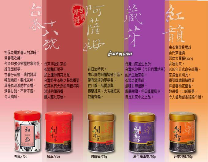 1936年,日本人在魚池鄉日月潭畔之貓囒山設立「魚池紅茶試驗支所」,並自印度引進阿薩姆茶種,發展紅茶產業 ,亦曾在倫敦拍賣會中名列頂級,也是日本天皇的御用珍品,民國四十年至六十年間,更是台灣農產品外銷主力。茶湯水色深紅,滋味濃郁甘醇帶有天然的麥芽香;除單獨飲用外,亦適合加入鮮奶調製成奶茶,茶湯轉成琥珀色,茶香中伴隨著奶香,「色」「香」「味」俱佳,且冷、熱飲用各有不同之風味。