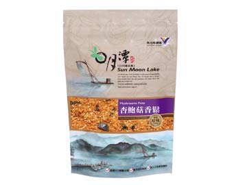 品名 杏鮑菇香鬆 重量 220克 包裝袋富有濃厚的日月潭特色